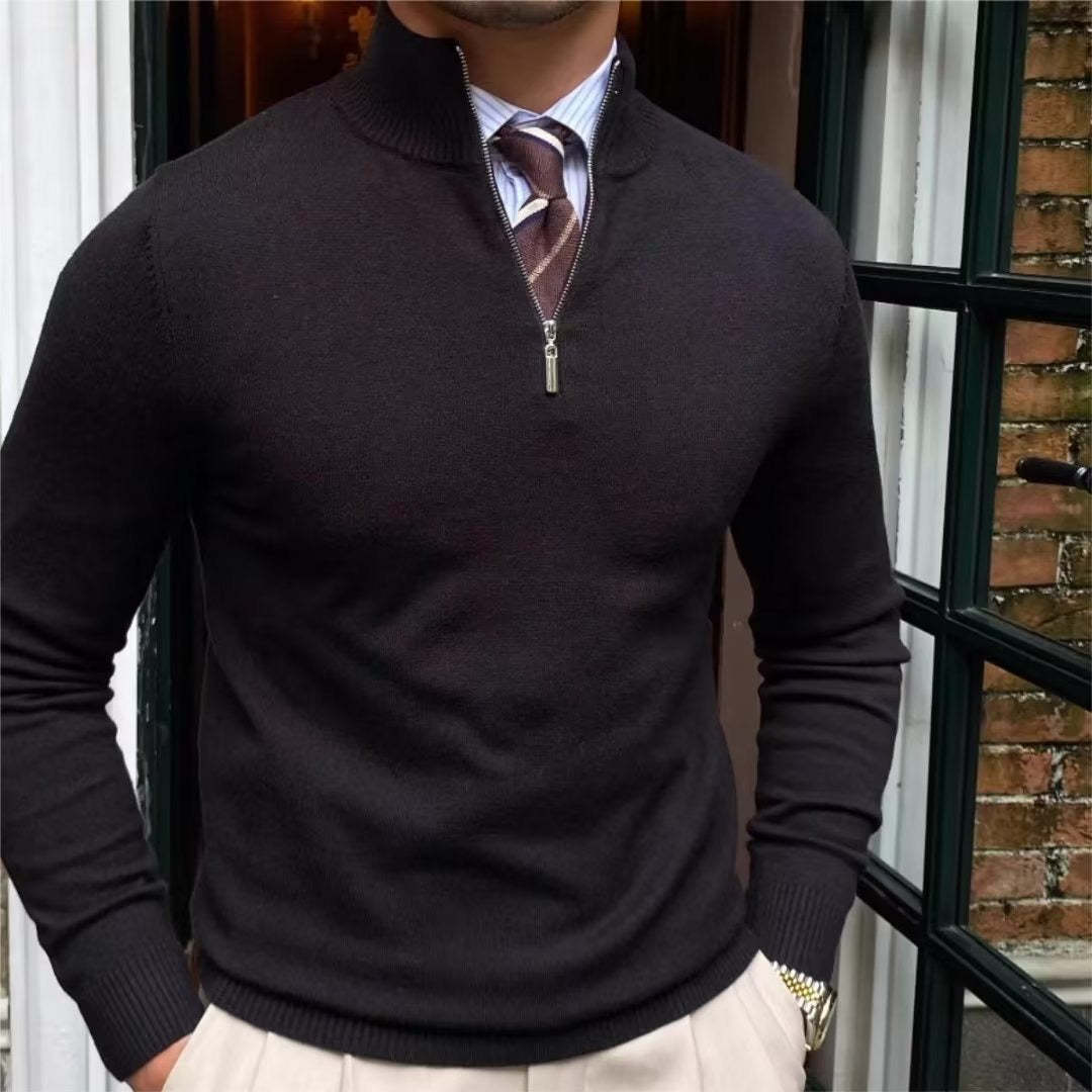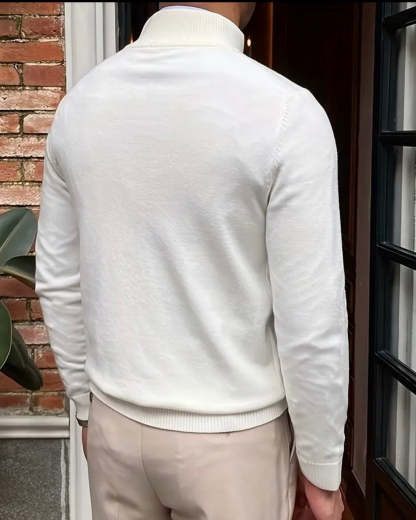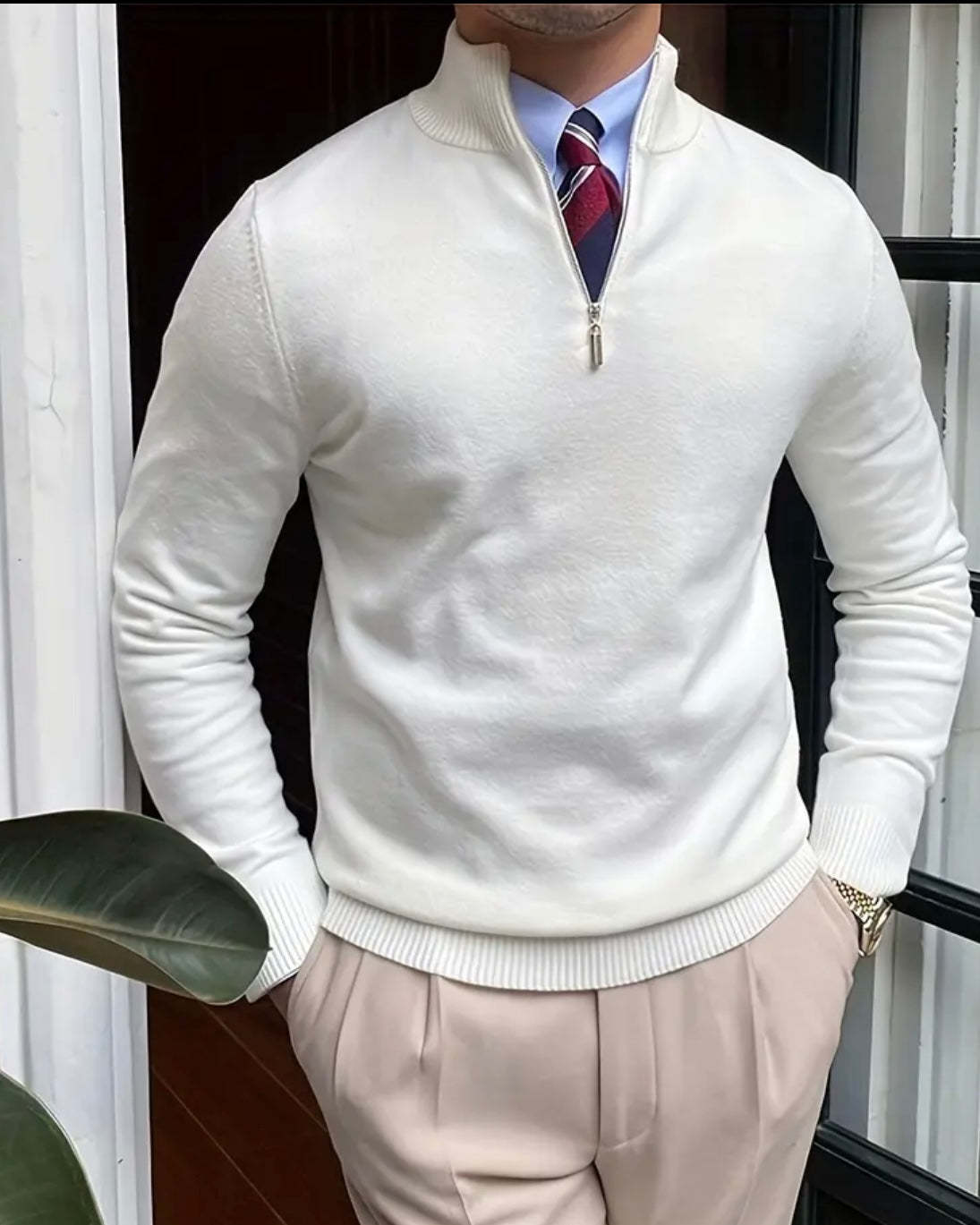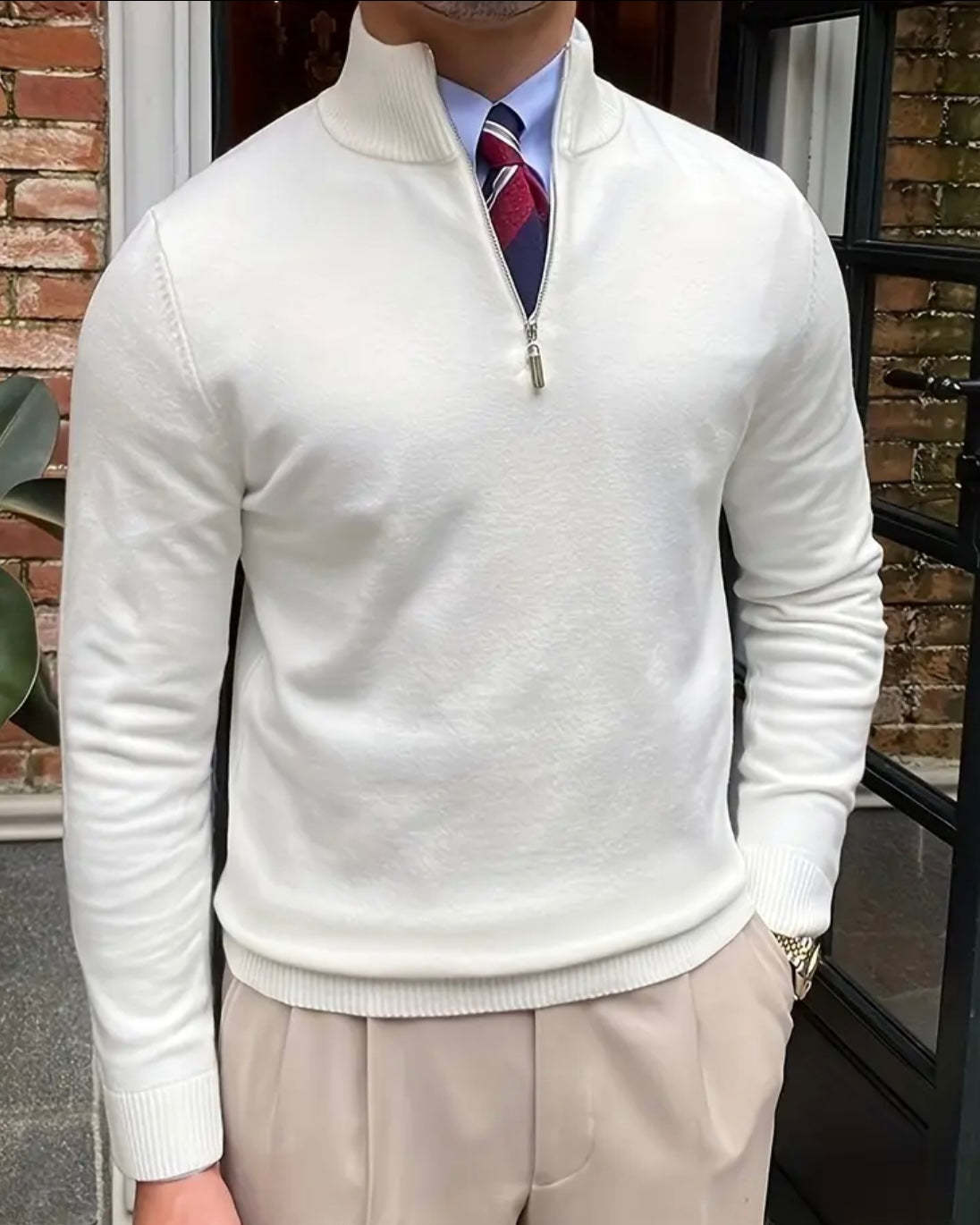 A timeless staple designed for effortless elegance. Crafted from soft cotton, this half-zip sweater blends comfort with refined sophistication. The sleek zip-up collar allows for versatile styling — wear it open for a relaxed look or zipped with a shirt and tie for a polished ensemble.
