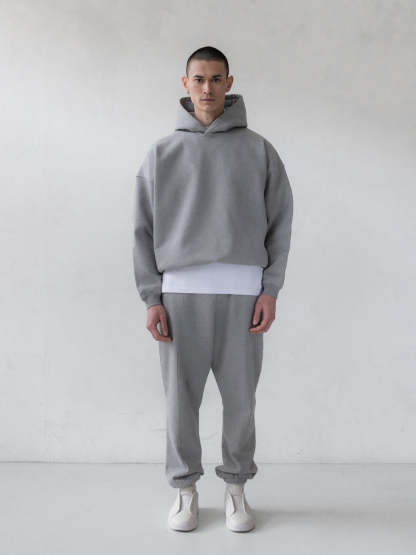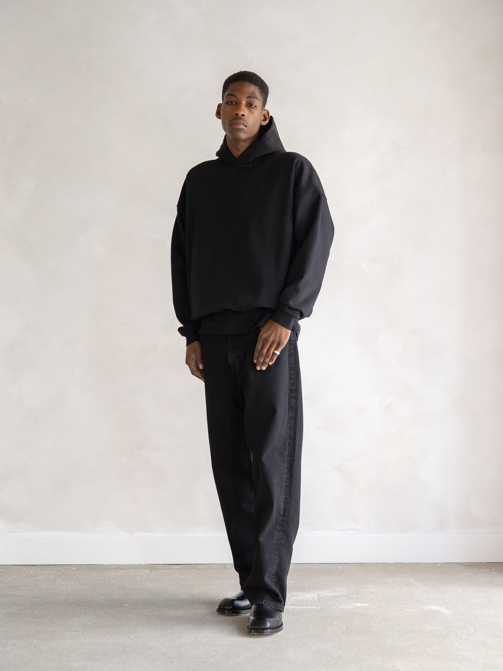 The Cotton Fleece Hoodie is made in Portugal from 495 GSM heavyweight cotton fleece, with a densely woven exterior and short-pile, brushed interior. The dropped shoulders and oversized fit create volume in the body and sleeves, while a slightly cinched waist defines the boxy silhouette. Finished with hidden side pockets and a double-layered hood.