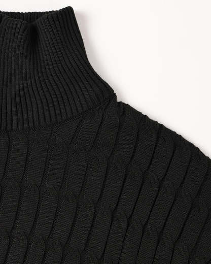 This men’s sweater is a work of intricate craftsmanship, cut from highest quality cotton that feels remarkably soft. It has meticulous wavy cable knits for a visually-appealing style, shaped with a high neck and long sleeves. Partial zipper closure lends it modernity, class and never-ending sophistication.
