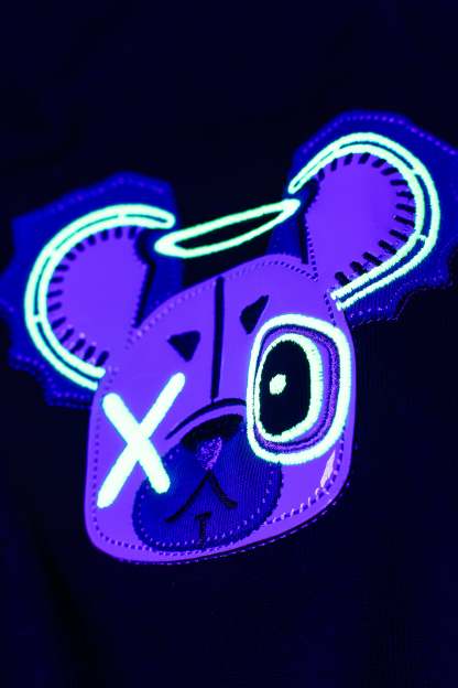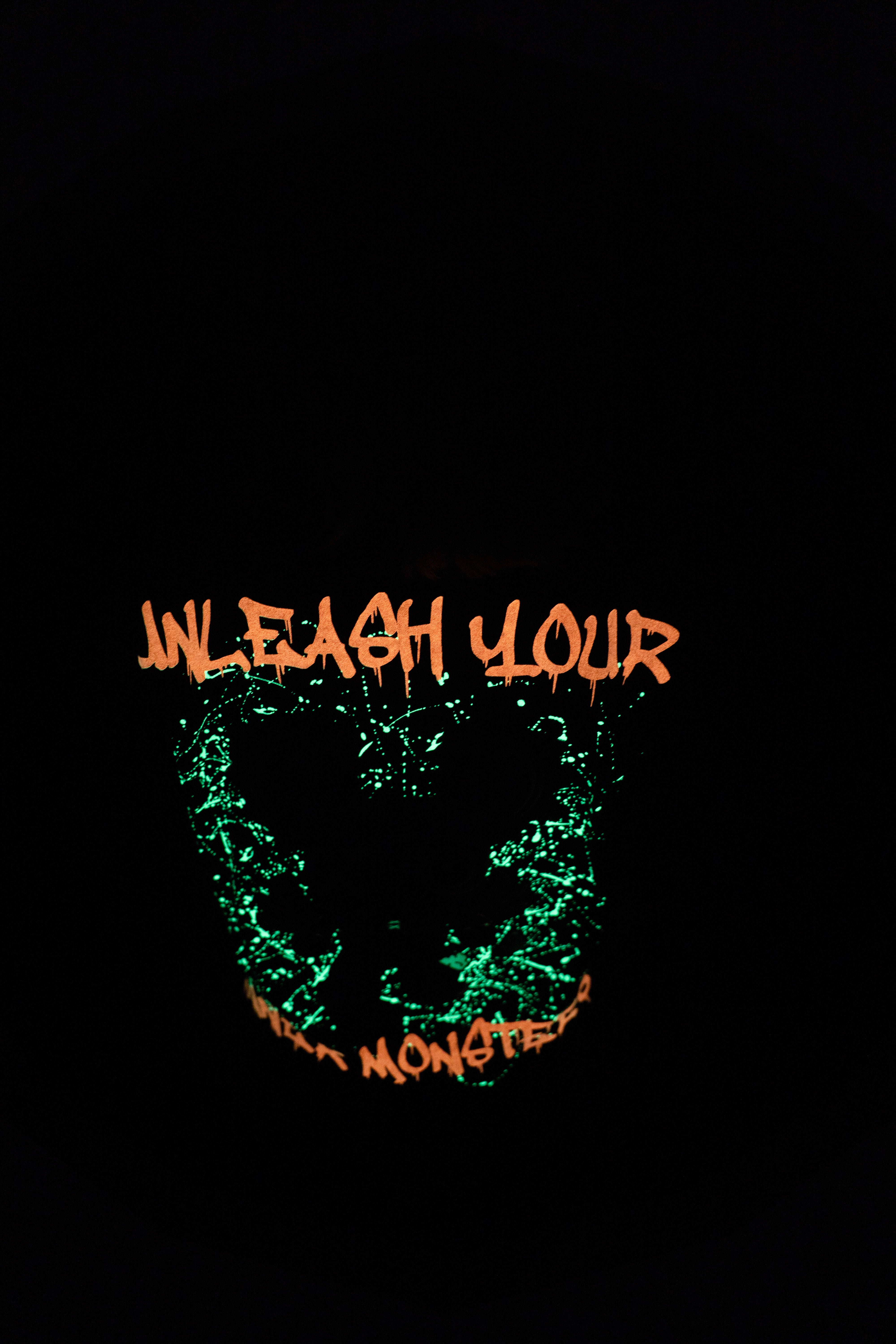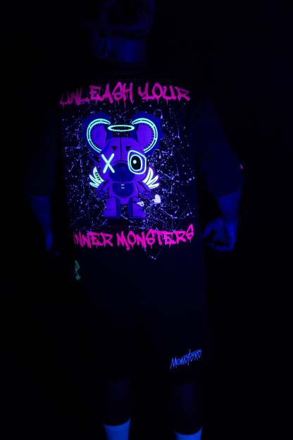 This oversized black t-shirt features a bold monster bear graphic with neon prints that react under UV light and glow in the dark. The front includes a small chest logo, while the back showcases a full-sized design with arrows and the phrase “WICK MONSTERS” in striking color. Made for those who want to stand out—day or night.