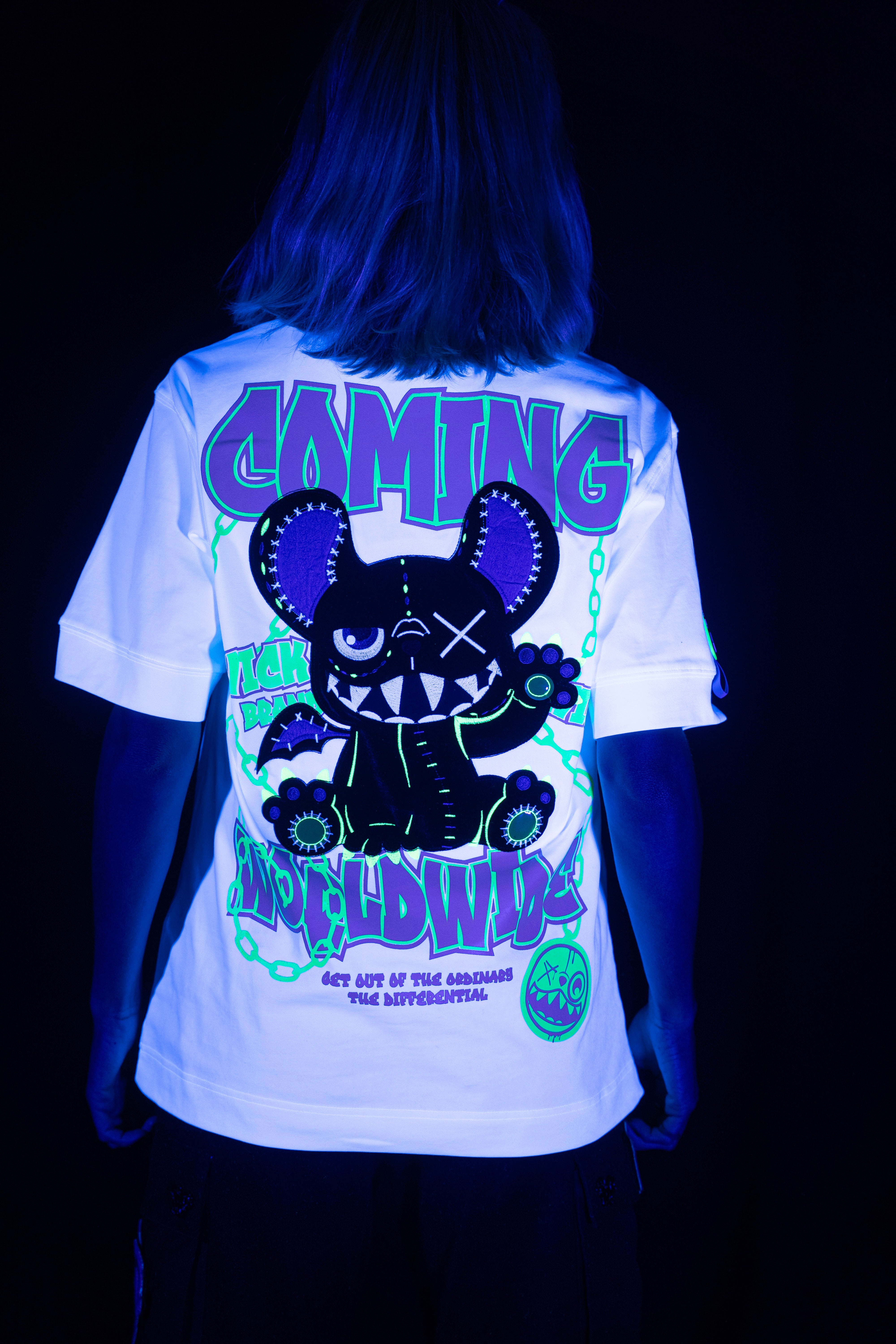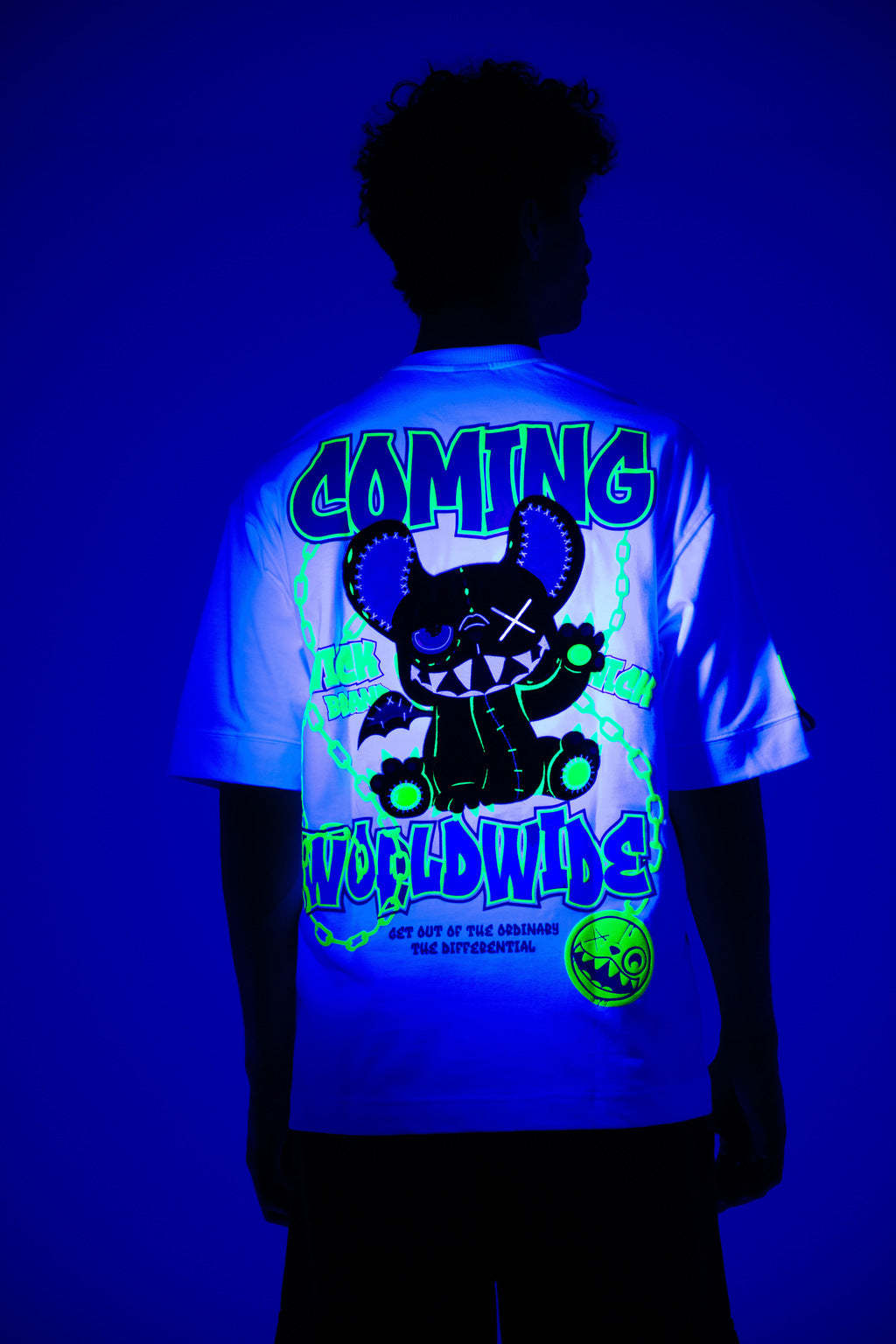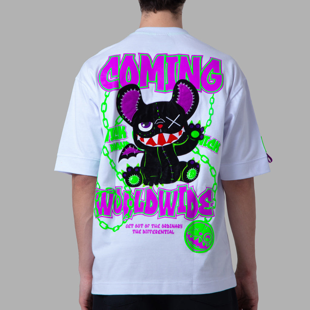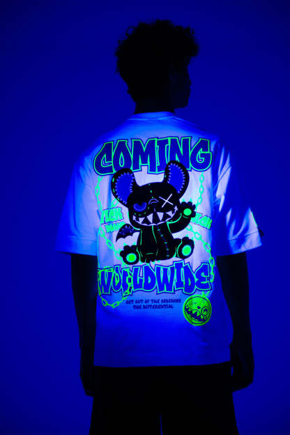 Stay wild and stand out in the Oversized NR White Chain Tee from Wick Monsters. This tee is a glow-in-the-dark revolution, featuring a trippy neon monster graphic that comes to life under UV light and glowin  in the dark . Whether you're hitting the streets or the club, this tee is your ticket to turning heads and making noise.