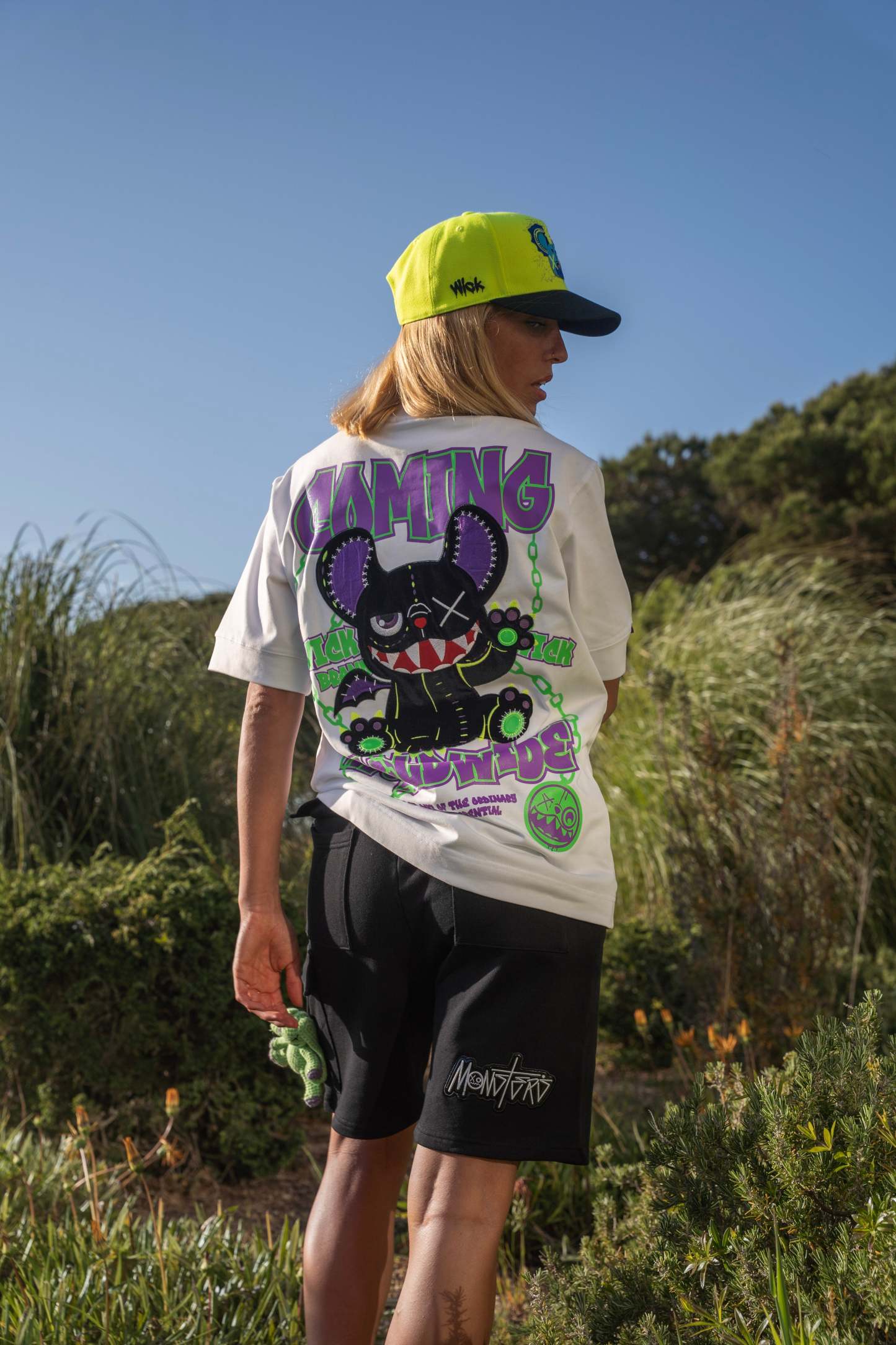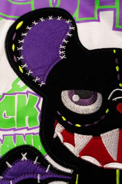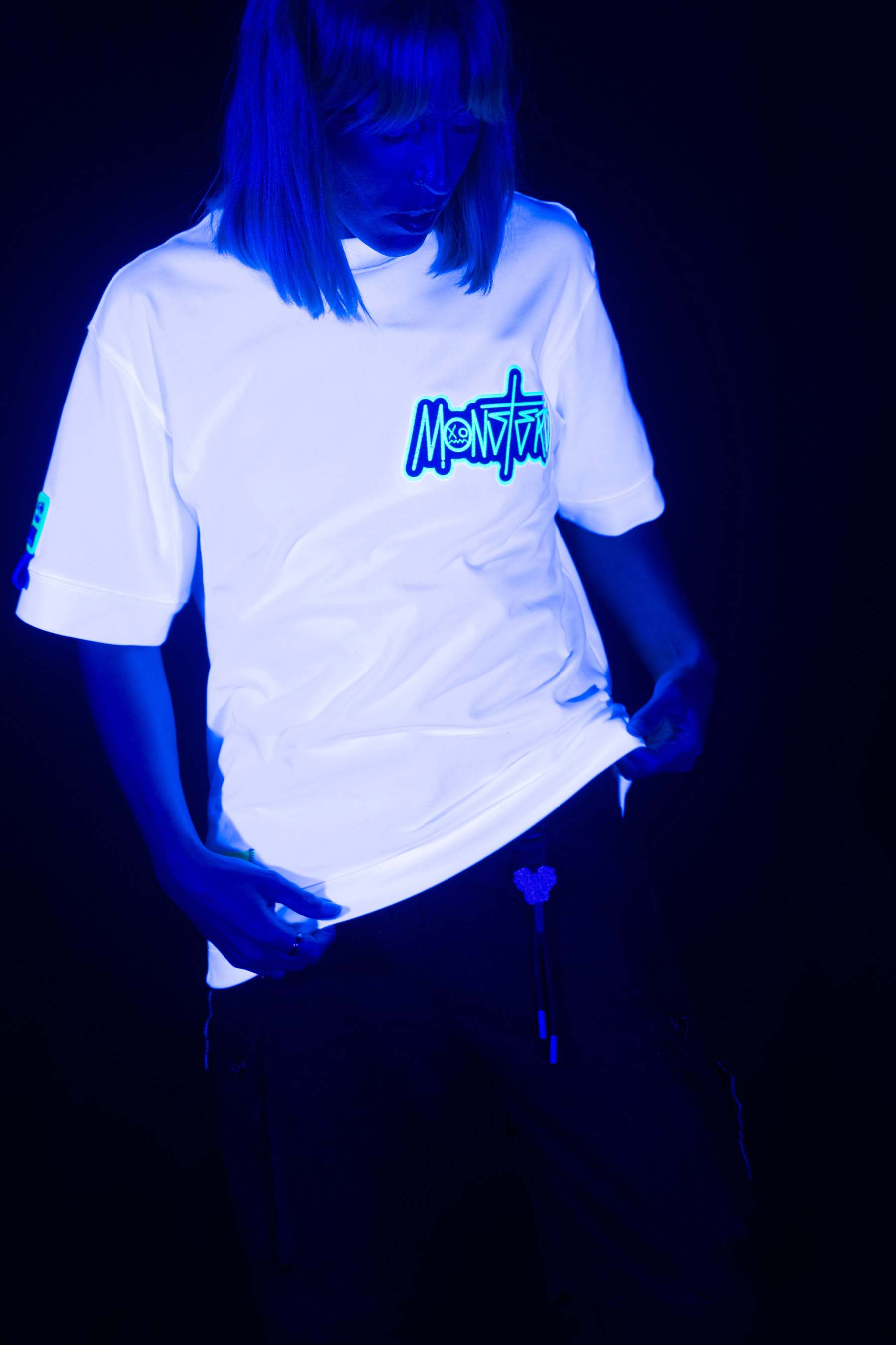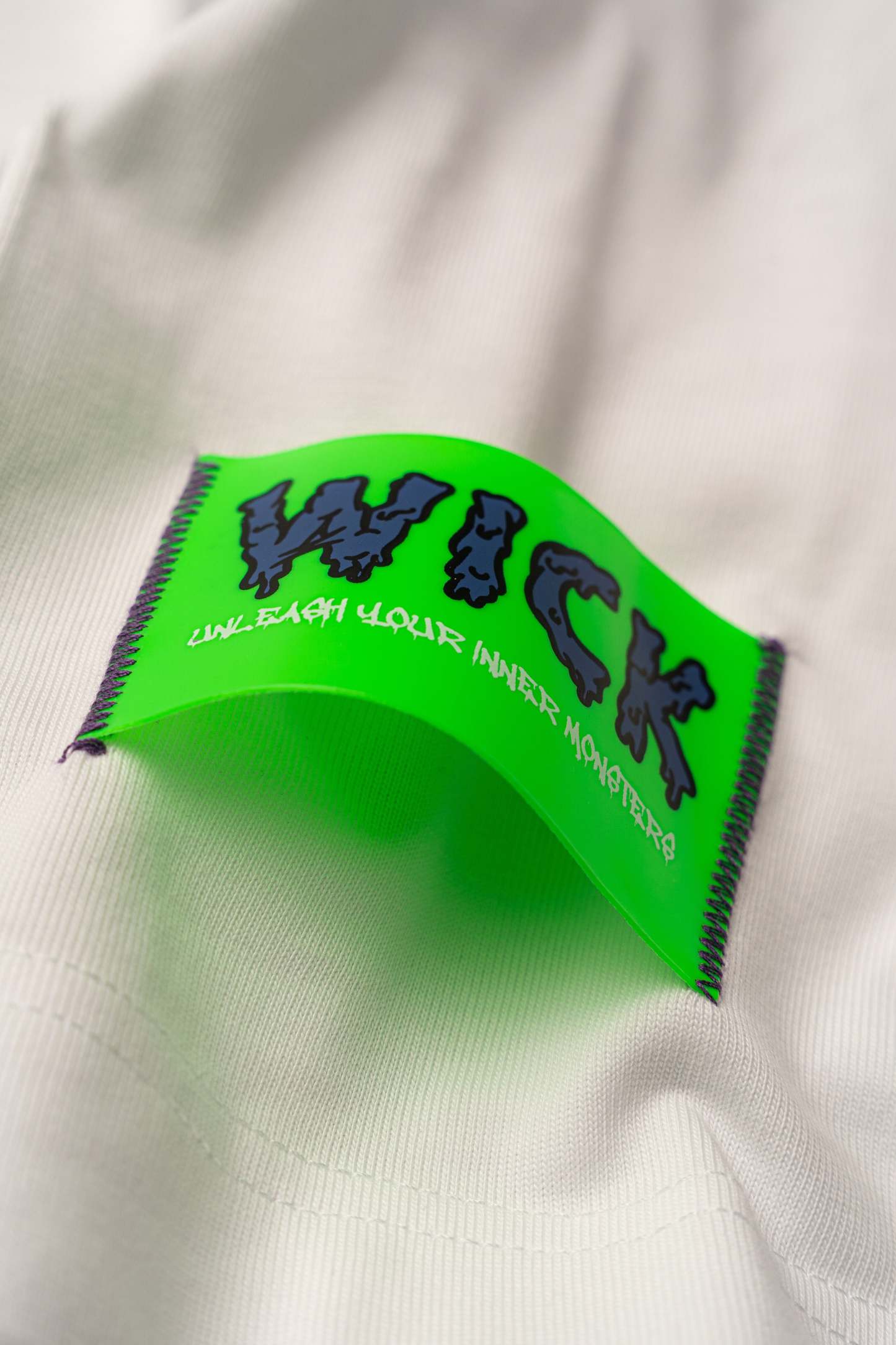Stay wild and stand out in the Oversized NR White Chain Tee from Wick Monsters. This tee is a glow-in-the-dark revolution, featuring a trippy neon monster graphic that comes to life under UV light and glowin  in the dark . Whether you're hitting the streets or the club, this tee is your ticket to turning heads and making noise.