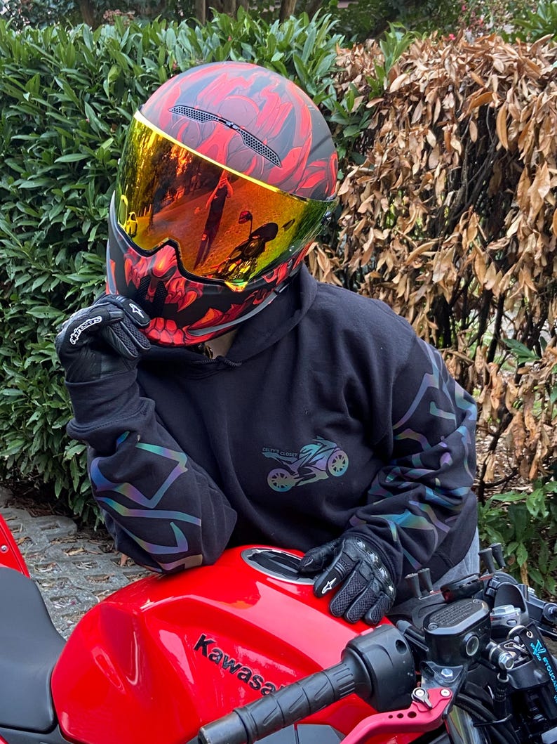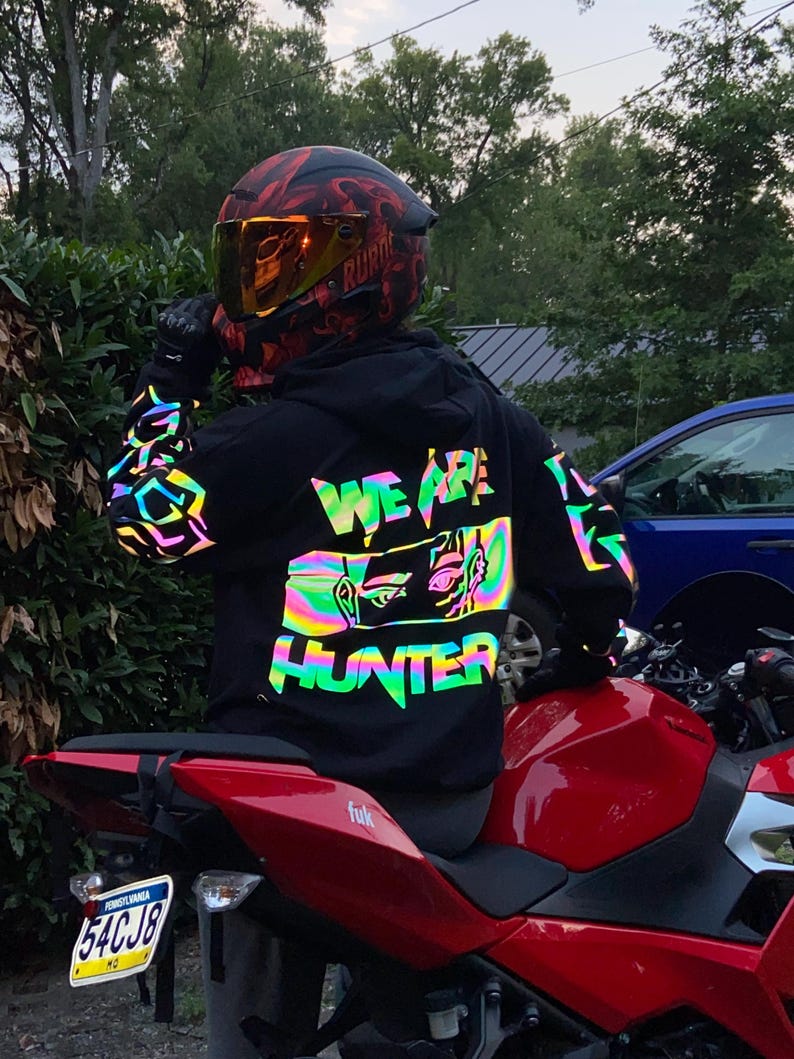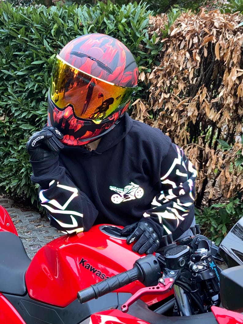 Meet your new nighttime essential - our intricately designed hoodies that don’t just keep you warm; they illuminate your presence. Created exclusively with bikers in mind, our unique garments feature reflective material that enhance your visibility under the sunlight, moonlight and headlights of the vehicles around you, ensuring you are visible when it matters most.
