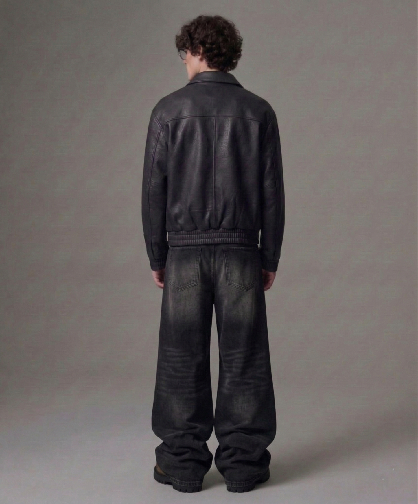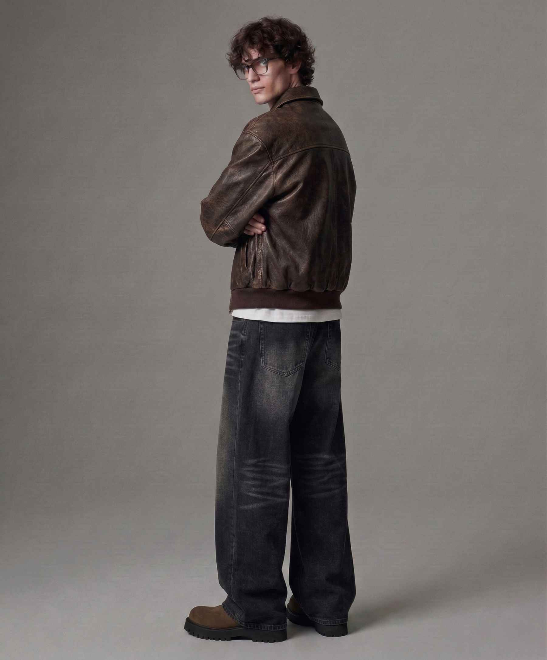 This garment is crafted from durable polyester fabric designed to replicate the look of vintage leather while remaining lightweight and comfortable for everyday wear. Produced using a tatting weaving technique, the material provides structure while maintaining flexibility.