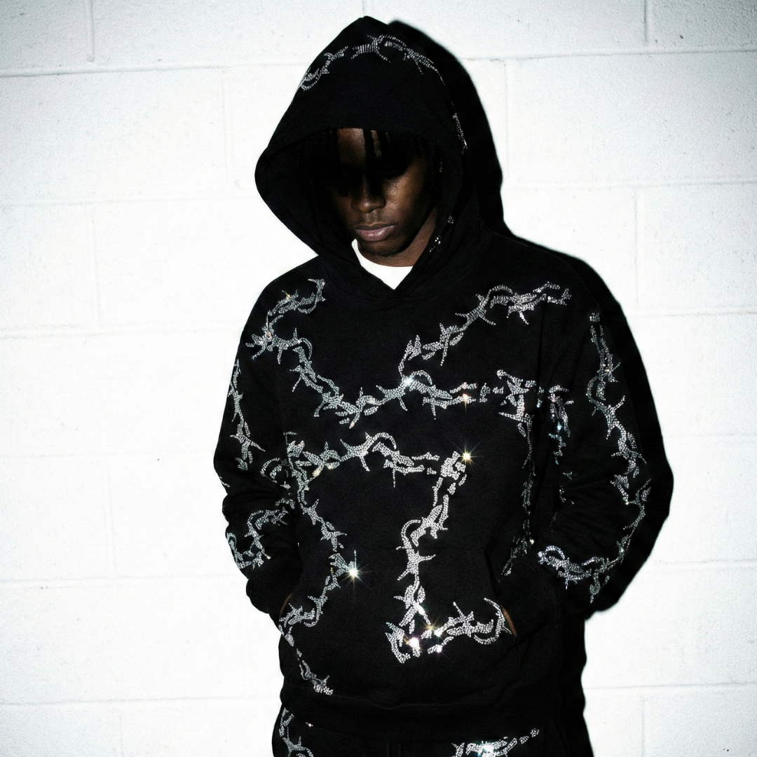 Elevate your wardrobe with the VYBES Rhinestone Thorn Hoodie,  perfect for those who dare to shine day or night. Handcrafted with extreme attention to detail this is a piece that will turn head and get compliments like you've never seen before.